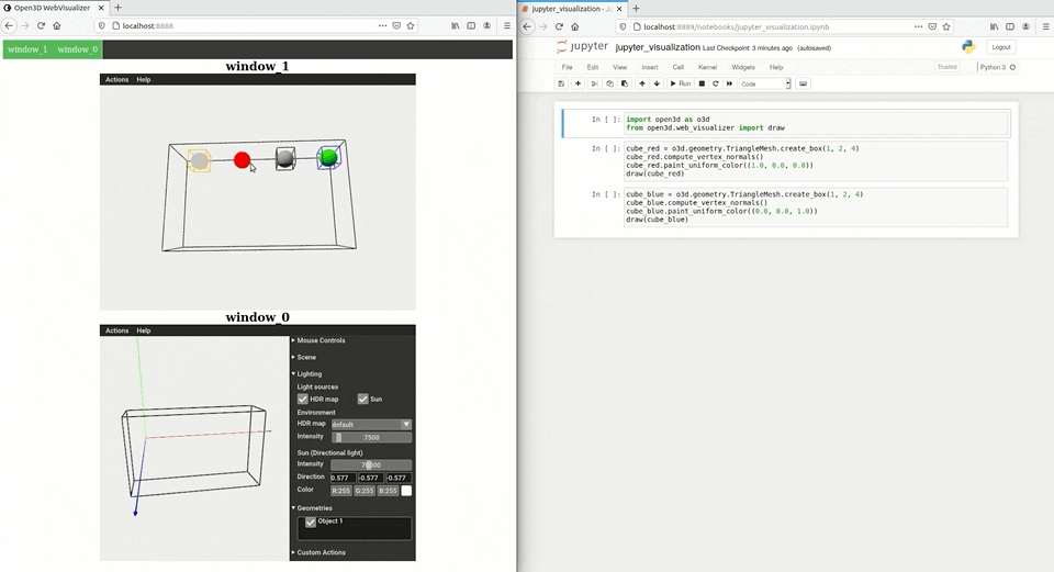Jupyter mode: Run CloudViewer web visualizer as embedded Jupyter cells. It supports both the Python Jupyter notebook and Jupyter lab environments. You’ll need to modify your code to use the non-blocking APIs and wrappers.